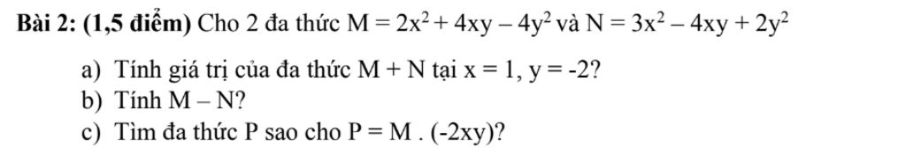 Bài 2: (1,5 điểm) Cho 2 đa thức M=`2x^2+ 4xy−4y^2` và N = `3x^2 – 4xy + 2y^2`