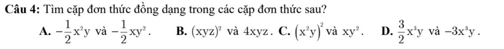 Câu 4: Tìm cặp đơn thức đồng dạng trong các cặp đơn thức sau?