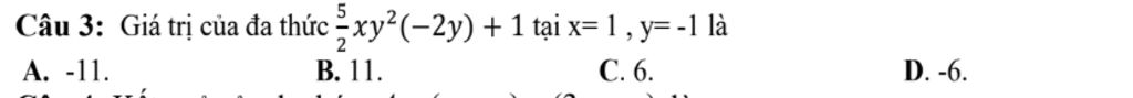 Câu 3: Giá trị của đa thức `5/2xy^2(−2y) + 1` tại x=1,y=-1 là
