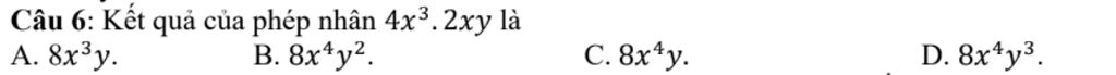 Câu 6: Kết quả của phép nhân `4x^3 .2xy` là