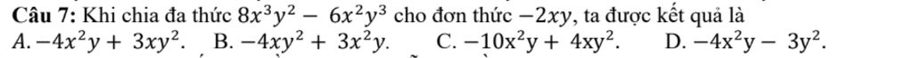 Câu 7: Khi chia đa thức `8x^3y^2 – 6x^2y^3` cho đơn thức −2xy, ta được kết quả là