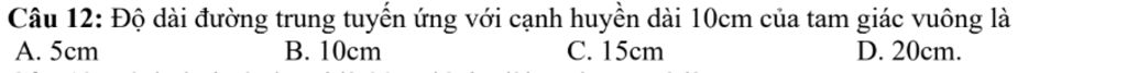 Câu 12: Độ dài đường trung tuyến ứng với cạnh huyền dài 10cm của tam giác vuông là