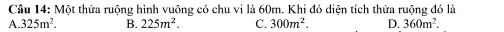 Câu 14: Một thửa ruộng hình vuông có chu vi là 60m. Khi đó diện tích thửa ruộng đó là