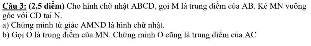 Câu 3: (2,5 điểm) Cho hình chữ nhật ABCD, gọi M là trung điểm của AB. Kẻ MN vuông