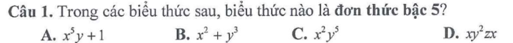 Câu 1. Trong các biểu thức sau, biểu thức nào là đơn thức bậc 5?