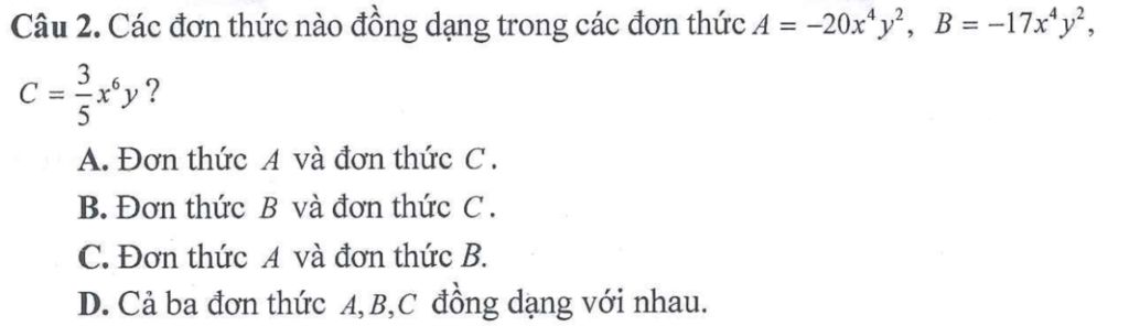Câu 2. Các đơn thức nào đồng dạng trong các đơn thức A = `-20x^4y^2`, B=`-17x^4y^2`, C = `3/5x^6y`
