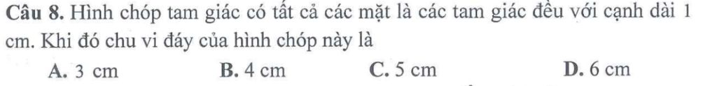 Câu 8. Hình chóp tam giác có tất cả các mặt là các tam giác đều với cạnh dài 1cm. Khi đó chu vi đáy của hình chóp này là