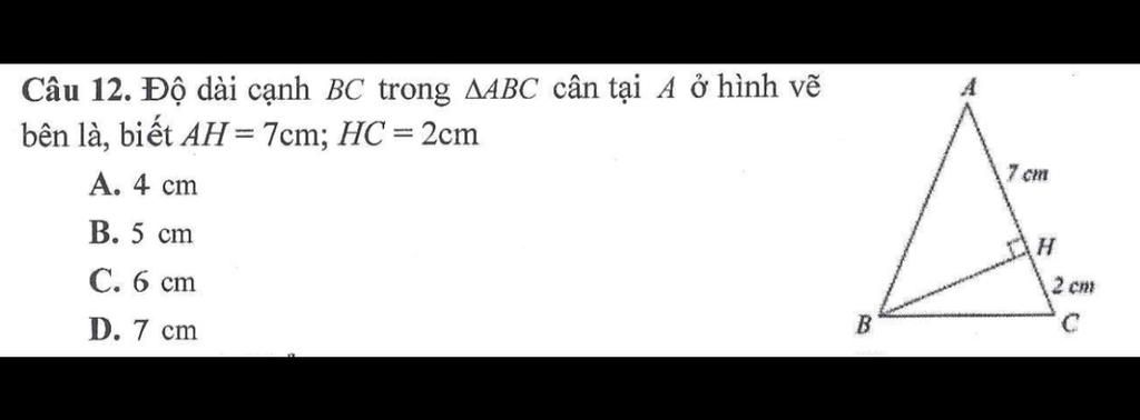 Câu 12. Độ dài cạnh BC trong tam giác ABC cân tại A ở hình vẽ bên là, biết AH = 7cm; HC = 2cm