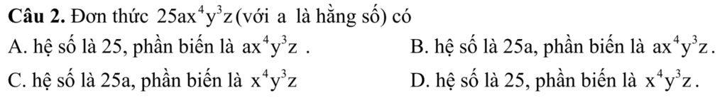Câu 2. Đơn thức `25ax^4y^3z` (với a là hằng số) có
