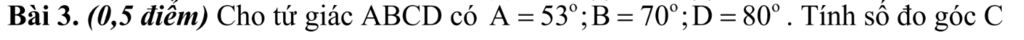 Bài 3. (0,5 điểm) Cho tứ giác ABCD có góc A =53°; góc B= 70°; góc D=80° . Tính số đo góc C.