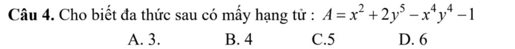 Câu 4. Cho biết đa thức sau có mấy hạng tử : A= `x² + 2y³^5 −x^4y^4 −1`