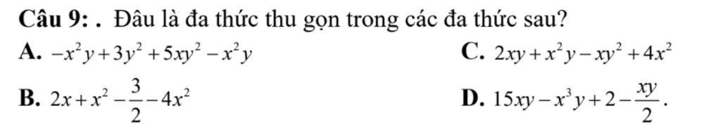 Câu 9: . Đâu là đa thức thu gọn trong các đa thức sau?
