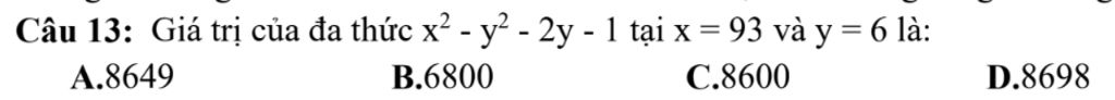 Câu 13: Giá trị của đa thức x² - y² - 2y - 1 tại x = 93 và y = 6 là:
