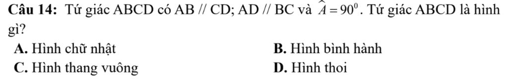 Câu 14: Tứ giác ABCD có AB // CD; AD // BC và Â =90°. Tứ giác ABCD là hình gì?