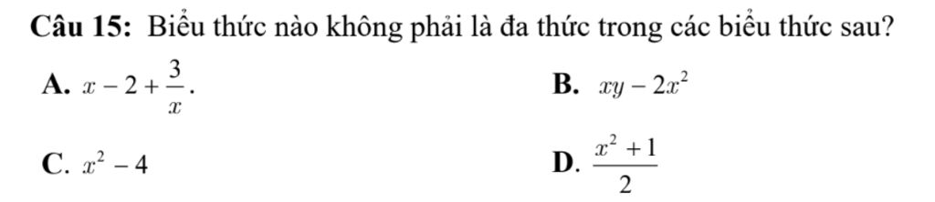 Câu 15: Biểu thức nào không phải là đa thức trong các biểu thức sau?