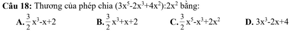 Câu 18: Thương của phép chia `(3x^5-2x^3+4x^2):2x^2` bằng: