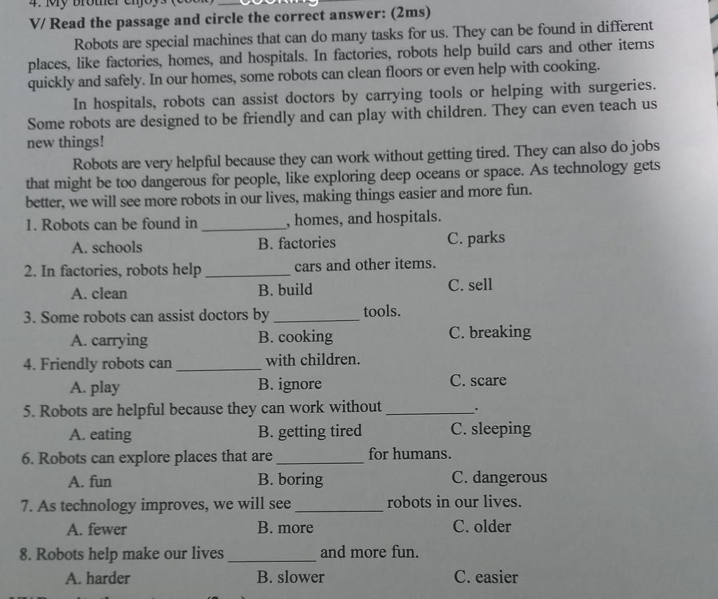 `-` Dchứng: "In hospitals, robots can assist doctors by carrying tools or helping with surgeries." (Trong bệnh viện, robot có thể hỗ trợ bác sĩ bằng cách mang dụng cụ hoặc giúp phẫu thuật.)