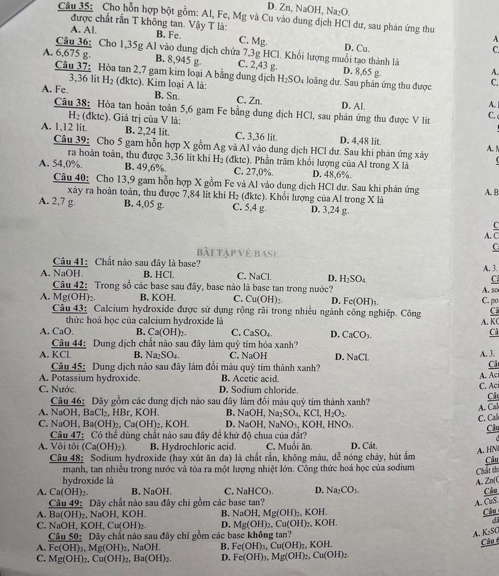 Câu 35: Cho hỗn hợp bột gồm: Al, Fe, Mg và Cu vào dung dịch HCl dư, sau phản ứng thu