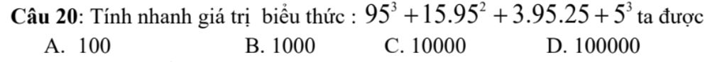 Câu 20: Tính nhanh giá trị biểu thức : `95^3 +15.95^2 +3.95.25 +5^3` ta được