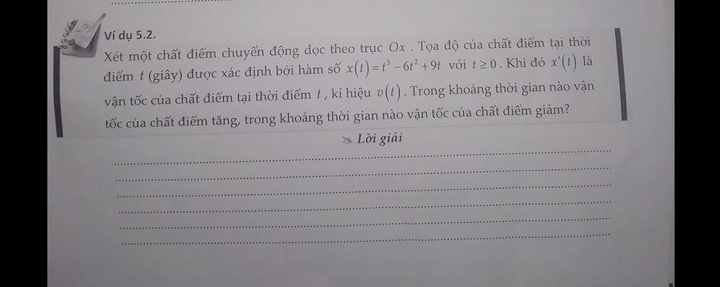 Vậy trong khoảng `(0;2)`, vận tốc của chất điểm giảm. Trong khoảng `(2;+oo)`, vận tốc của chất điểm tăng.