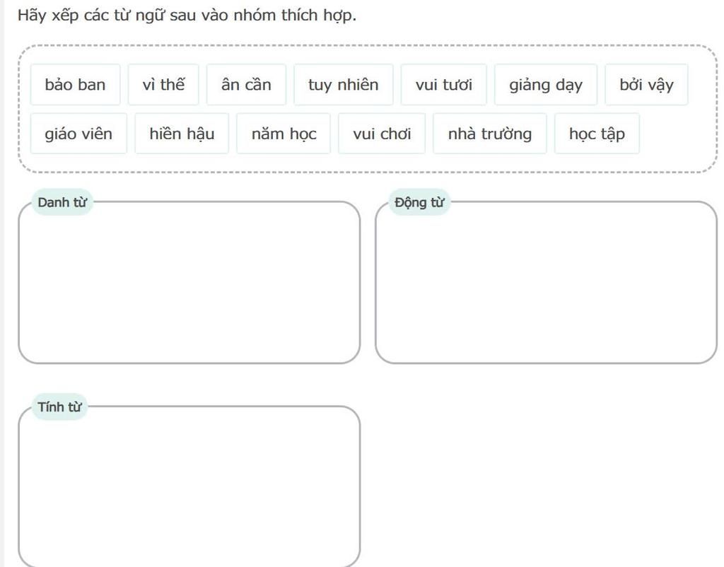 `-` Động từ: bảo ban, giảng dạy, vui chơi, học tập.