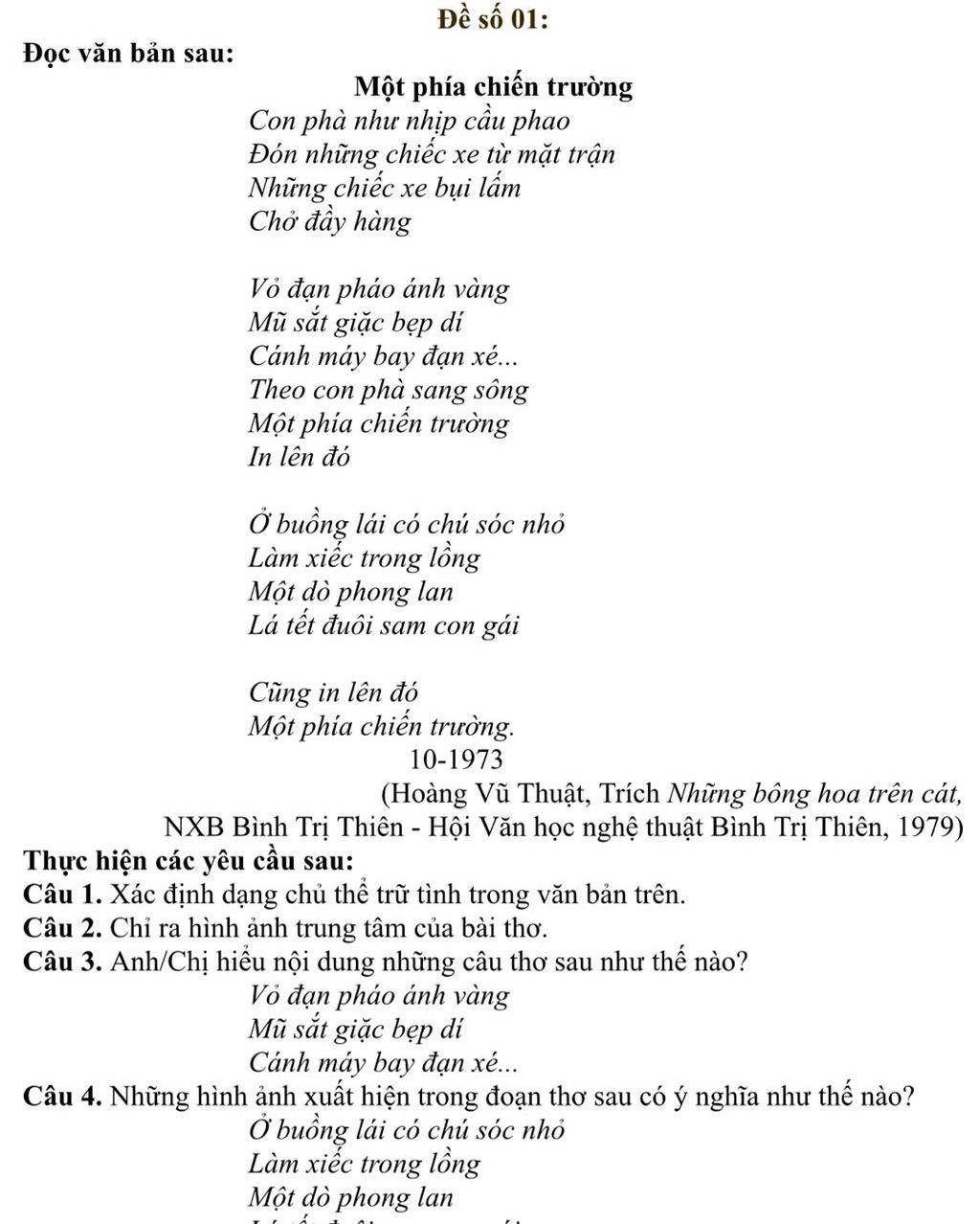 Câu 1: Chủ thể trữ tình trong tác phẩm “ Một phía chiến trường” của Hoàng Vũ Thuật thể hiện những tâm tư, cảm xúc, tình cảm của tác giả về chiến trường. Qua đó mang tính trữ tình sâu sắc. Bài thơ không chỉ khắc họa cảnh vật mà thông qua từng câu chữ tác giả đã gửi những tâm tư tình cảm của con người trong chiến tranh.