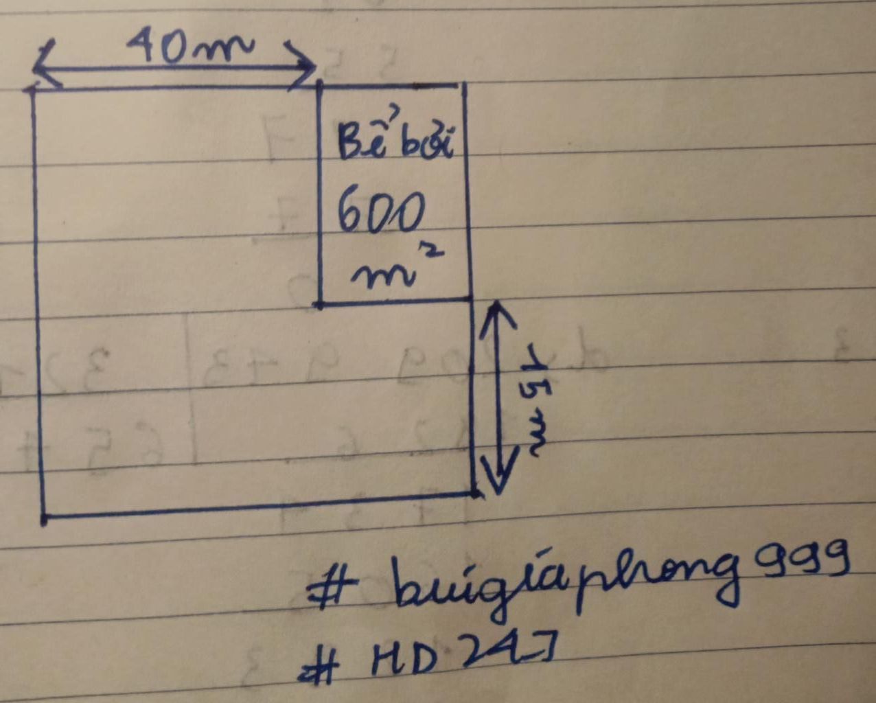 Trong một khu đất có dạng hình vuông, người ta dành một mảnh đất có dạng hình chữ nhật ở góc khu đất để làm bể bơi (Hình bên). Biết diện tích của bể bơi bằng `600 m^2`, hãy tính độ dài cạnh của khu đất.