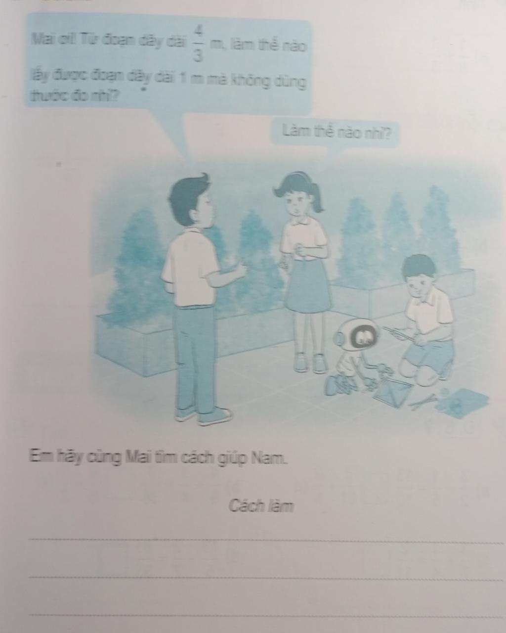 Câu hỏi`:`Từ đoạn dây dài `4/3 m,` làm thế nào lấy được đoạn dây dài `1m` mà không dùng thước đo nhỉ?