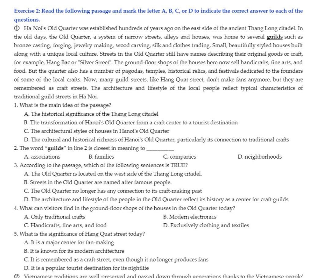 `1` D. The cultural and historical richness of Hanoi's Old Quarter.....