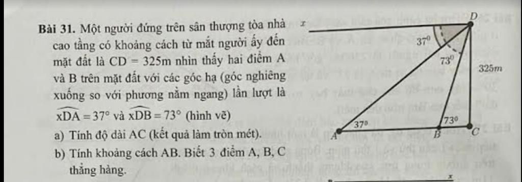 $\tan A=\dfrac{CD}{AC}\to AC=\dfrac{CD}{\tan A}=\dfrac{325}{\tan37^o}\approx 431(m)$