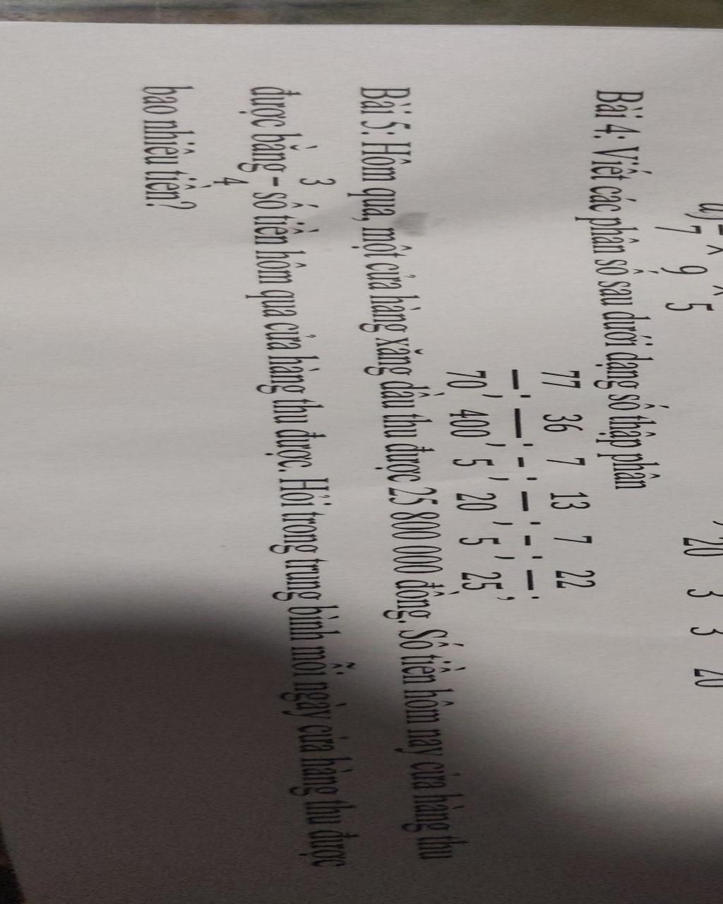 Bài 4)77/70=11/10=1,1 ;36/400=9/100=0,09 ;7/5=14/10=1,4 ;13/20=65/100=0,63