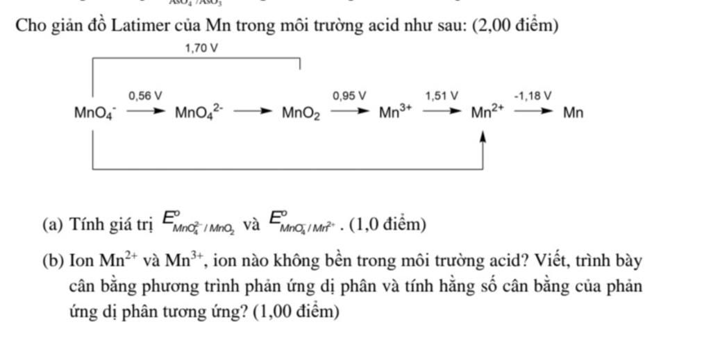 Có: $E_{MnO_4^-/MnO_2}=1.70V$ và $E_{MnO_4^-/MnO_4^{2-}}=0.56V$