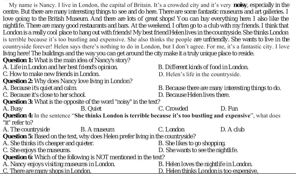 Đoạn văn nói về cuộc sống ở thành phố Luân Đôn của Nancy và quan điểm của người bạn Helen về thành phố này.