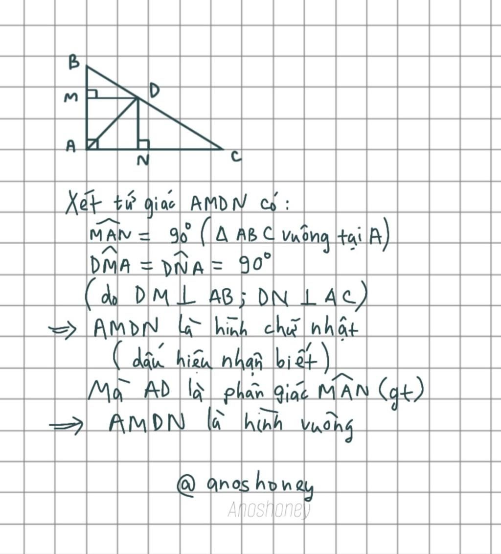 Cho tam giác ABC vuông tại A, đường phân giác AD. Gọi M,N là chân đường vuông góc kẻ từ D đến AB,AC. C/m tứ giác MAND là hình vuông