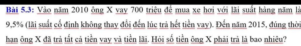 Bài 5.3: Vào năm 2010 ông X vay 700 triệu để mua xe hơi với lãi suất hàng năm là
