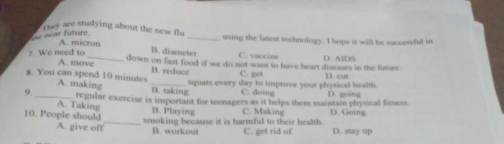 1, C, vaccine vì micron là micro mét, diameter là đường kính, AIDS là bệnh nên không liên quan đến flu