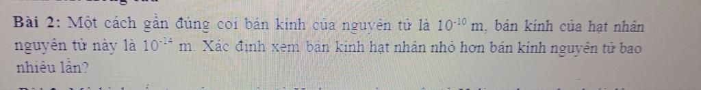 Bán kính hạt nhân nhỏ hơn bán kính nguyên tử bằng tỉ lệ giữa bán kính nguyên tử và bán kính hạt nhân `=(10^{-10})/(10^{-14})=10000(\text{lần})`