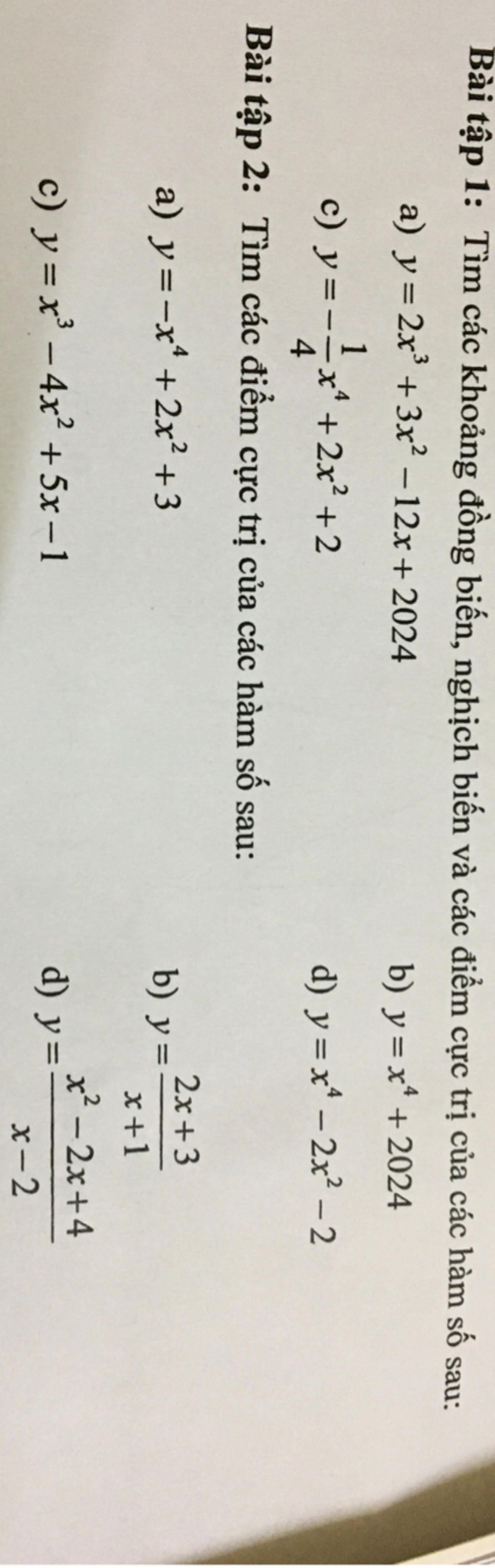 Bài tập 1: Tìm các khoảng đồng biến, nghịch biến và các điểm cực trị của các hàm số sau: