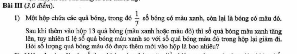 $\to$Tỉ lệ số bóng xanh và đỏ là $\dfrac17x:(\dfrac67x)=\dfrac16$