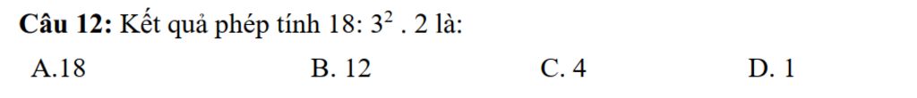 Câu 12: Kết quả phép tính 18: $3^{2}$ . 2 là: