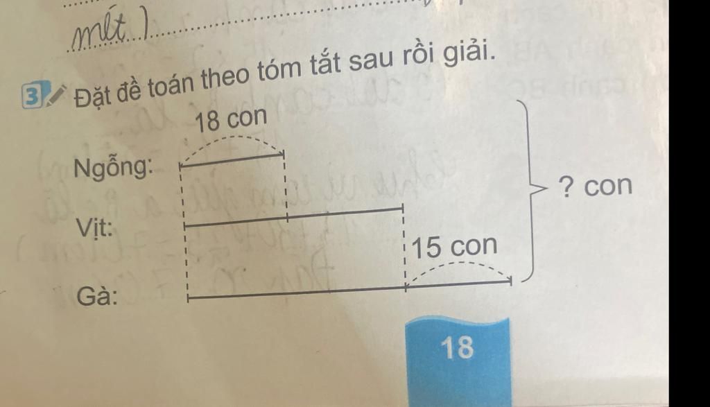 Đề (ý kiến riêng): Trong trang trại có 18 con ngỗng, số con vịt gấp đôi số ngỗng. Số con gà hơn vịt là 15 con. Hỏi trong trang trại có tất cả bao nhiêu con vật?