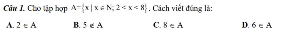 Câu 1. Cho tập hợp A={x|x∈N;2<x<8} . Cách viết đúng là: