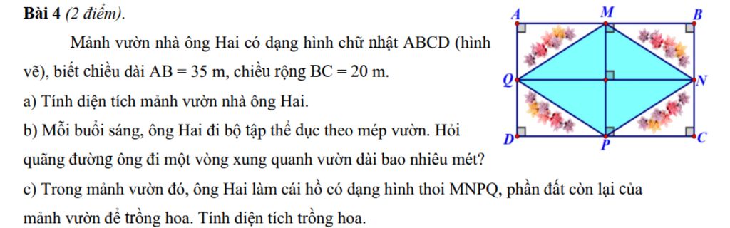 Bài 4 (2 điểm). Mảnh vườn nhà ông Hai có dạng hình chữ nhật ABCD (hình vẽ), biết chiều dài AB=35 m, chiều rộng BC = 20 m.