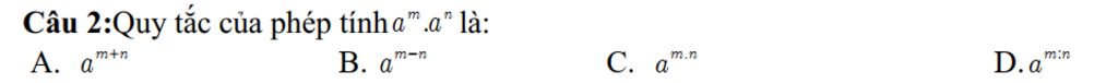 Câu 2:Quy tắc của phép tính $a^{m}$.$a^{n}$ là: