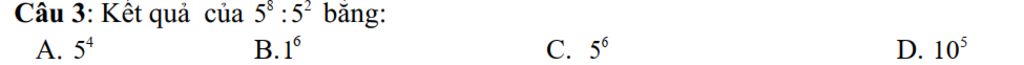 Câu 3: Kết quả của $5^{8}$:5 băng: