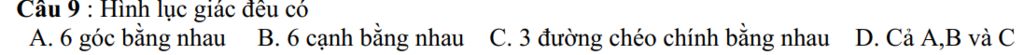 `-` Hình lục giác đều có: `6` góc, `6` cạnh bằng nhau và `3` đường chéo chính bằng nhau