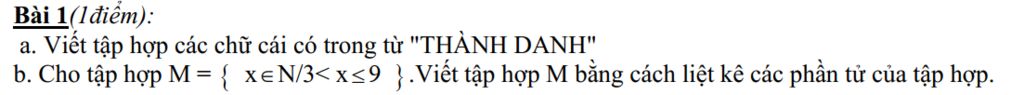 b. Cho tập hợp M = { x ∈ N/3<x<9 }.Viết tập hợp M bằng cách liệt kê các phần tử của tập hợp.