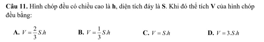 Câu 11. Hình chóp đều có chiều cao là h, diện tích đáy là S. Khi đó thể tích V của hình chóp đều bằng: