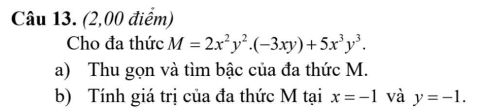 Câu 13. (2,00 điểm) Cho đa thức M = 2x^2y^2.(−3xy)+5x^3y^3.