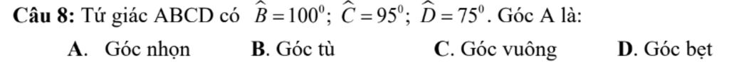 Câu 8: Tứ giác ABCD có B=100°; C =95°; D=75°. Góc A là:
